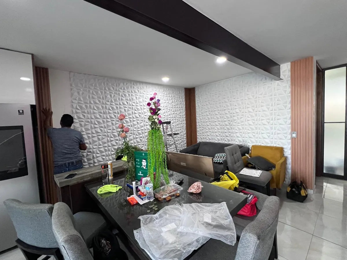 Yo pensé que iba a estar complicado de pegar, pero NOOOO. En una tarde dejé mi sala como nueva. Tapó humedad y la pared quedó elegante. Ya mis vecinas lo quieren también 😂